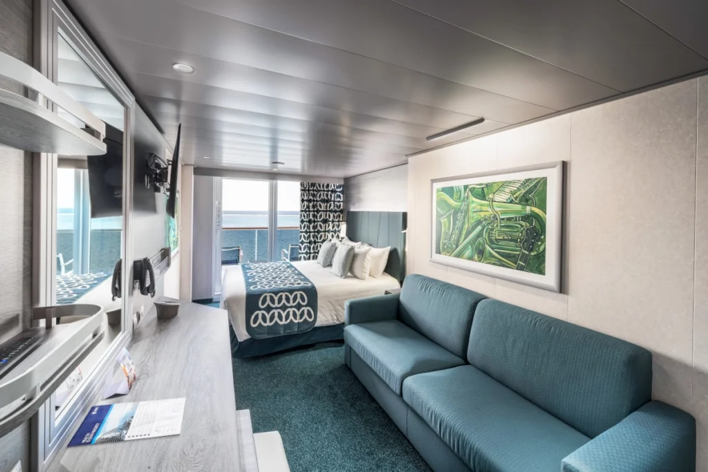 cabine com varanda para quem valoriza ter um espaço externo privado durante o cruzeiro, oferecendo a oportunidade de desfrutar da paisagem e do ar fresco sem sair da própria cabine.